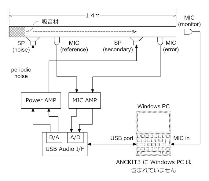 - 実スケールの消音システム開発のための試作・実験機材として(ANCKIT3のプログラム、機材を流用してWindows PCベースの実用レベルの消音システムを開発可能です)